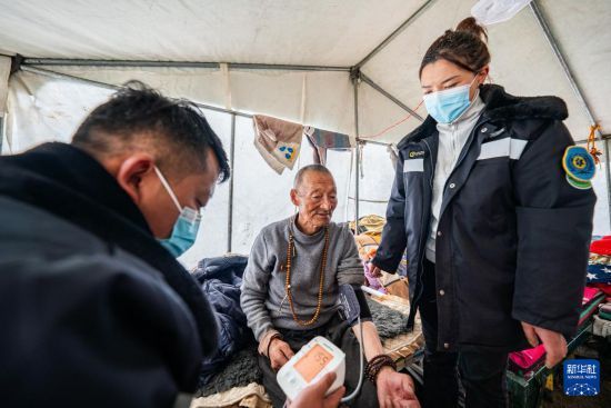 在那曲市索縣西昌鄉(xiāng),衛(wèi)生院醫(yī)務(wù)人員為蟲(chóng)草採(cǎi)集點(diǎn)的牧民測(cè)量血壓(5月18日攝)。新華社記者 丁增尼達(dá) 攝